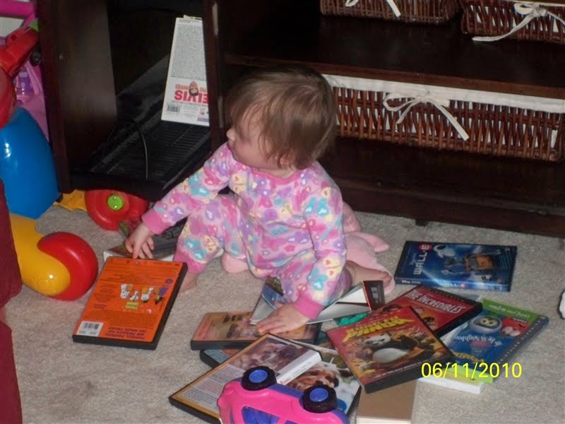 I also moved all the kids videos and some random VHS tapes to the lower cabinets, that way if she wanted to get in them at least it was her stuff. She spent most of this evening pulling movies out of the cabinet and sitting on her puzzles.